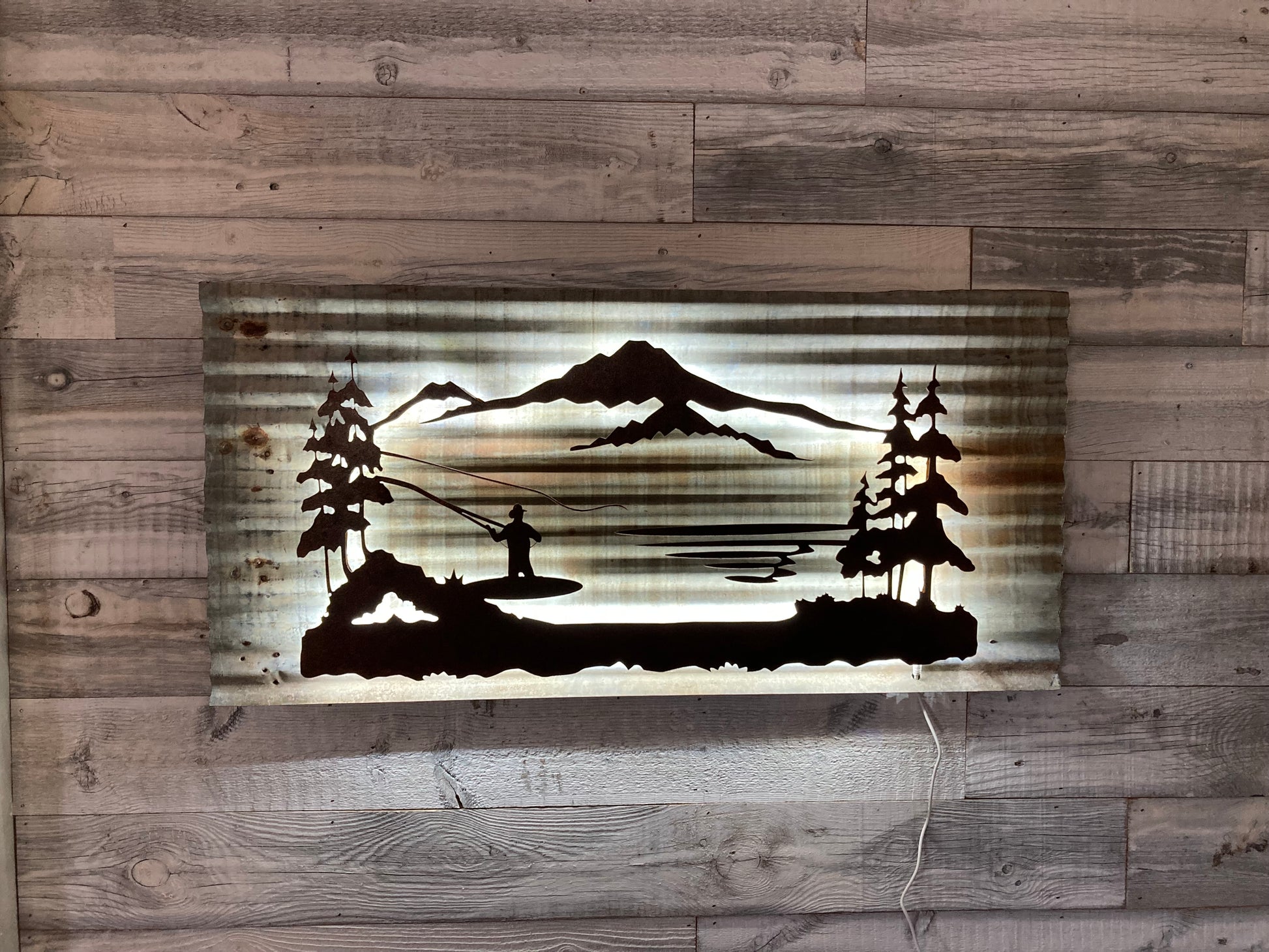 Standard Size = 18”tall x 36”wide x 3”thick. Fly fishing scene on rustic tin with LED back lighting. Corrugated Tin or Wood background option. Shipping cost will increase due to size.